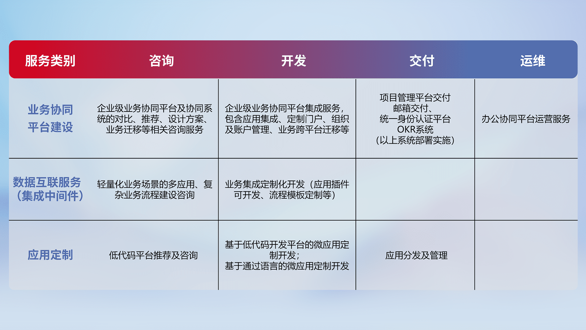 针对钉钉、、、、企微、、、、IDaas等平台级产品提供产品的规划、、、方案、、、、交付、、、、定制化开发等服务,,,,实现如统一协同办公、、智能客户服务、、混合会议管理、、、智能数据查询、、等业务场景,,,,实现数字化转型。。